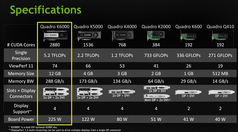 Отличная новость для самых взыскательных пользователей, профессионально занимающихся компьютерной анимацией и 3D-моделированием! Пресс-служба компании NVIDIA анонсировала выпуск, как утверждается, самой мощной на сегодняшний день одночиповой видеокарты для рабочих станций, а именно модели Quadro K6000 на передовой архитектуре Kepler. В основу новинки лёг созданный по 28-нм проектным нормам чип GK110 с максимально возможным для данного GPU количеством активных ядер CUDA, равным 2880 штукам, а также с 256 текстурными модулями (TMU) и с 48 блоками растеризации (ROP). Модель имеет на борту аж 12 Гбайт памяти GDDR5 с полосой пропускания 288 Гбайт/с. По объёму это в два раза больше, чем у ускорителя Quadro 6000, являющегося флагманом среди профессиональных графических адаптеров NVIDIA на архитектуре Fermi. Видеокарта Quadro K6000 изготовлена на чёрной печатной плате под шину PCI Express 3.0 x16 и оборудована двухслотовым кулером с одним вентилятором. Её заявленная производительность составляет 5,2 TFLOPS. При этом уровень TDP равен 225 Вт.Из прочих технических характеристик новинки известно то, что её набор коммуникационных возможностей состоит из выведенных на заднюю панель двух портов DVI и пары выходов DisplayPort. Ожидается, что к осени текущего года собственные версии Quadro K6000 представят компании PNY Technologies, ELSA Technology и Leadtek Research, а первыми новинку применят в своих продуктах такие производители, как Dell, Hewlett-Packard и Lenovo.