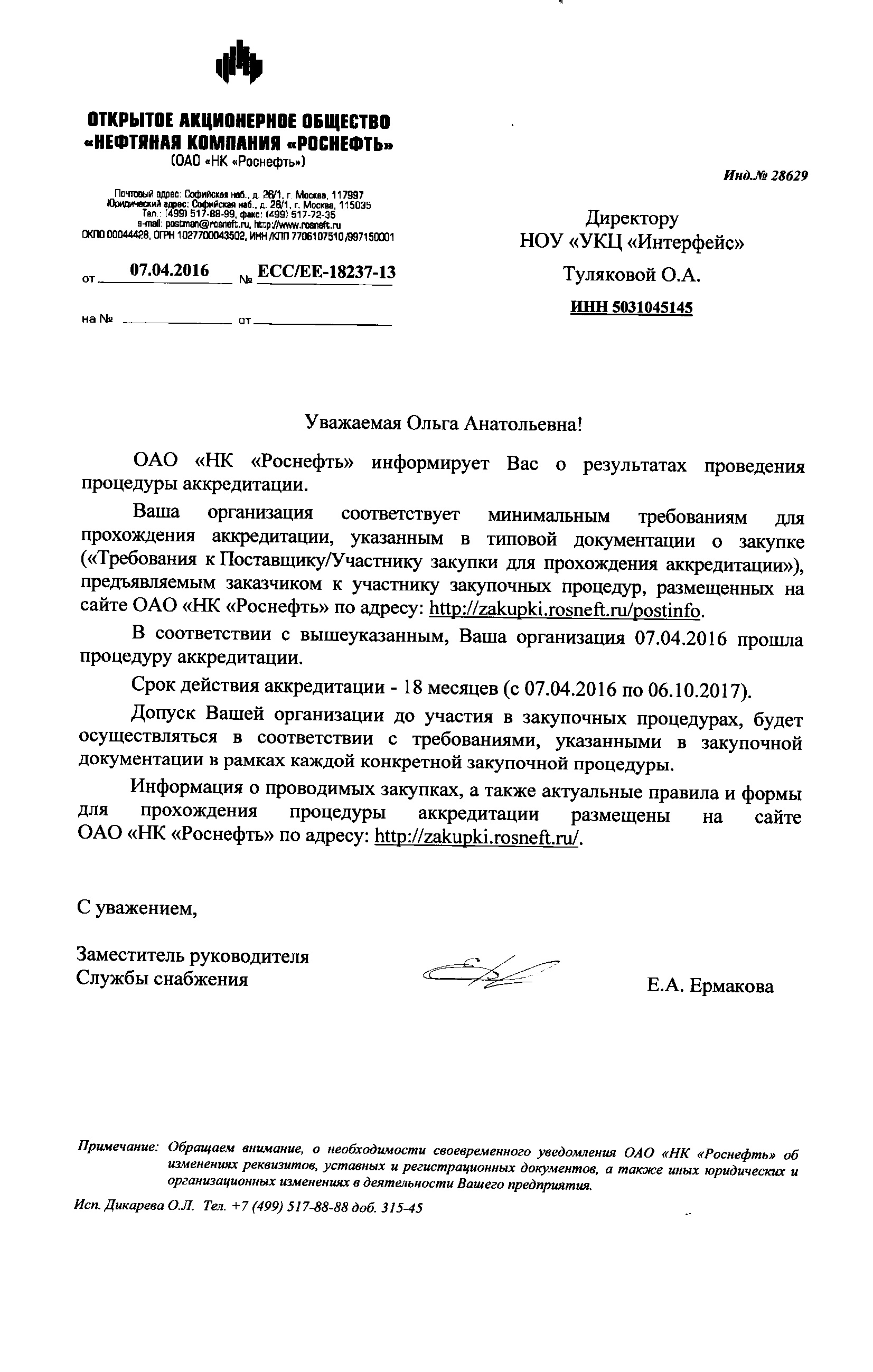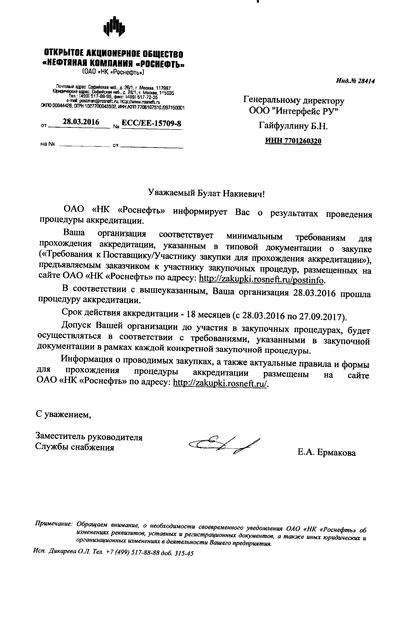 Информационное письмо об аккредитации "Интерфейс РУ" в ОАО "НК "Роснефть"